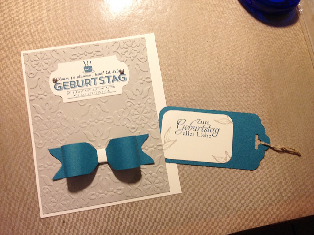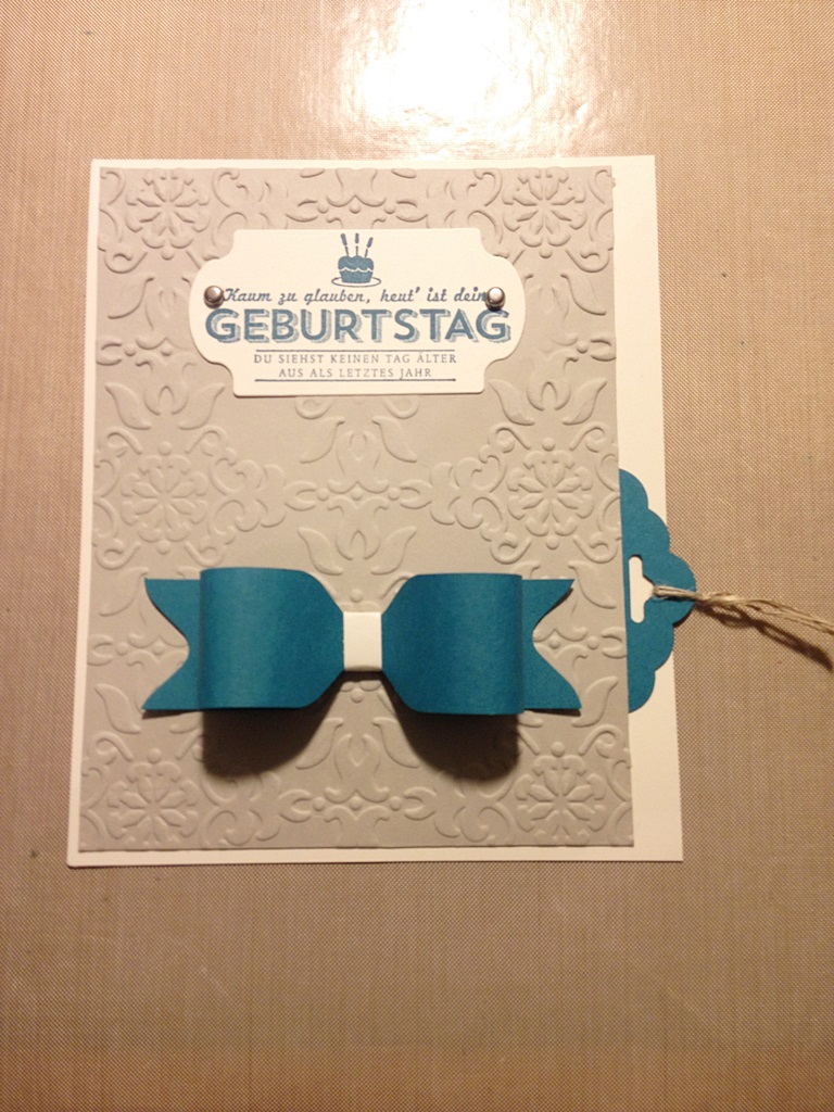 Geburtstage sind immer eine gern genommene Entschuldigung Möglichkeit, Zeit beim Werkeln zu verbringen und Dinge auszuprobieren, die mir in den Weiten des Internets über die Füße gelaufen waren. Dieses Video erklärt z.B., wie man mit dem Stampin‘ Up! Umschlagboard schicke Papierschleifen machen kann. Und da ich das Board liiiebe, musste beim nächsten Geburtstag prompt eine solche Schleife verbaut werden: