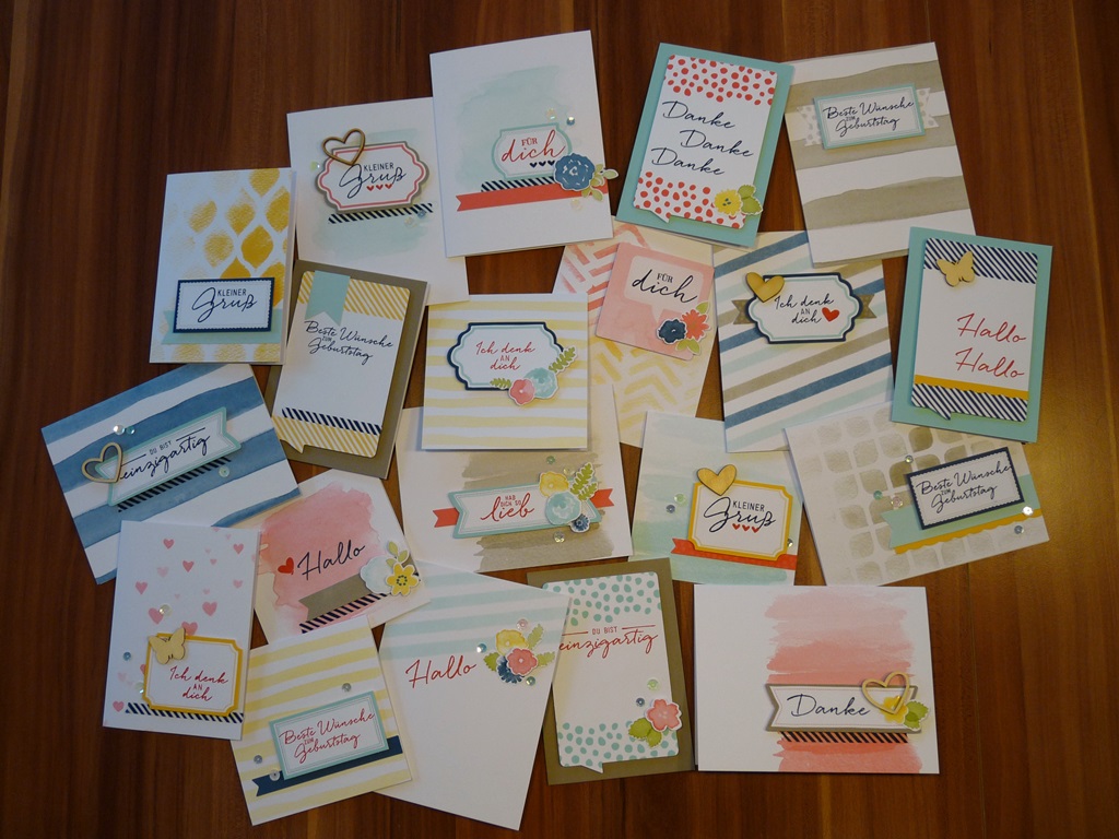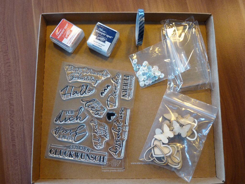 So heißt eines der Kartensets aus dem aktuellen Jahreskatalog. Bis jetzt haben mich Sets nie sonderlich interessiert, aber die Schriftstempel fand ich soooo toll – und die gibt es eben nur, wenn man das Set kauft. Der Preis hat mich erst einmal zögern lassen, bis ich das Kleingedruckte gelesen habe: Material für 20 Karten inklusive Acrylblock, Stempelset mit 12 Stempeln (!), 2 kleinen Stempelkissen, Pailetten, Aufkleber, Motivklebeband, 3D-Klebepads, fertige Verzierungen… fehlt nur noch der Kleber, und den habe ich eh schon. Also quasi ein Rundum-Glücklich-Paket 🙂