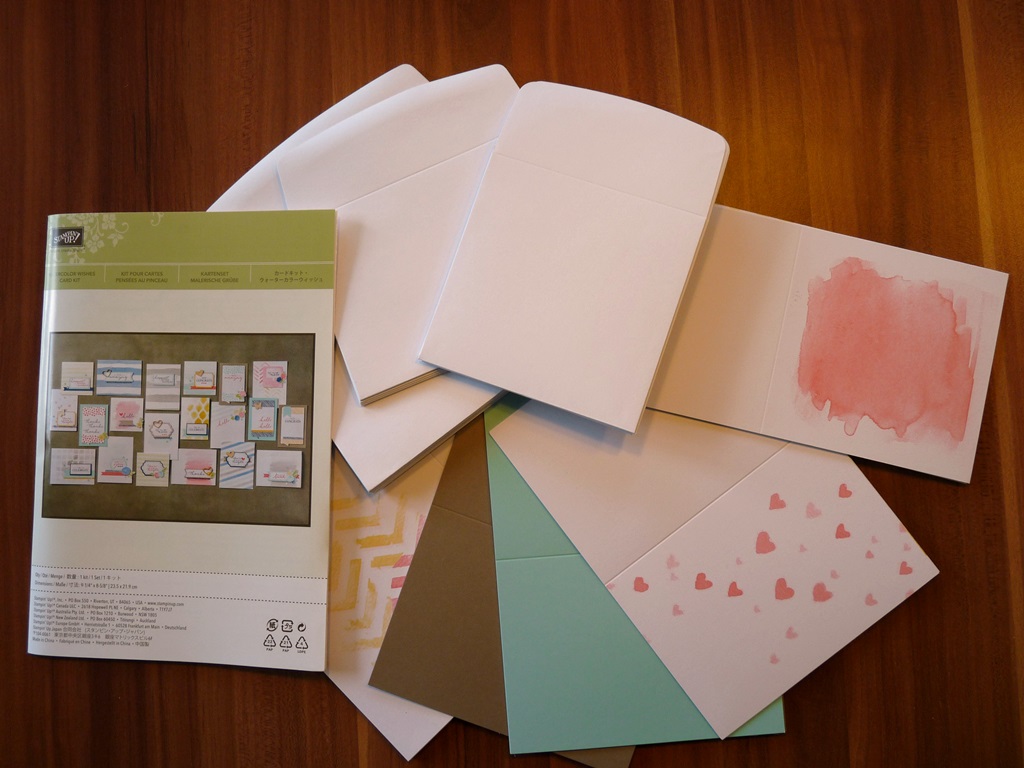 Es gibt eine Anleitung mit einer kurzen Beschreibung der Arbeitsschritte und Vorschlägen, wie man die Karten mit den vorhandenen Materialien gestalten kann. Ich habe mich dann auch (größtenteils) an die Anleitung gehalten; einfach um mal zu sehen, wie es läuft. Was soll ich sagen – schnell, einfach, und sehr entspannend, wenn man abends noch schnell was basteln möchte, aber zu müde und unleidlich für eigene Kreativität ist. Flugs eine Karte zusammengebaut und ein kleines Erfolgserlebnis schließt den Tag ab!