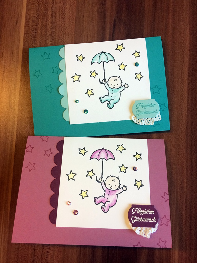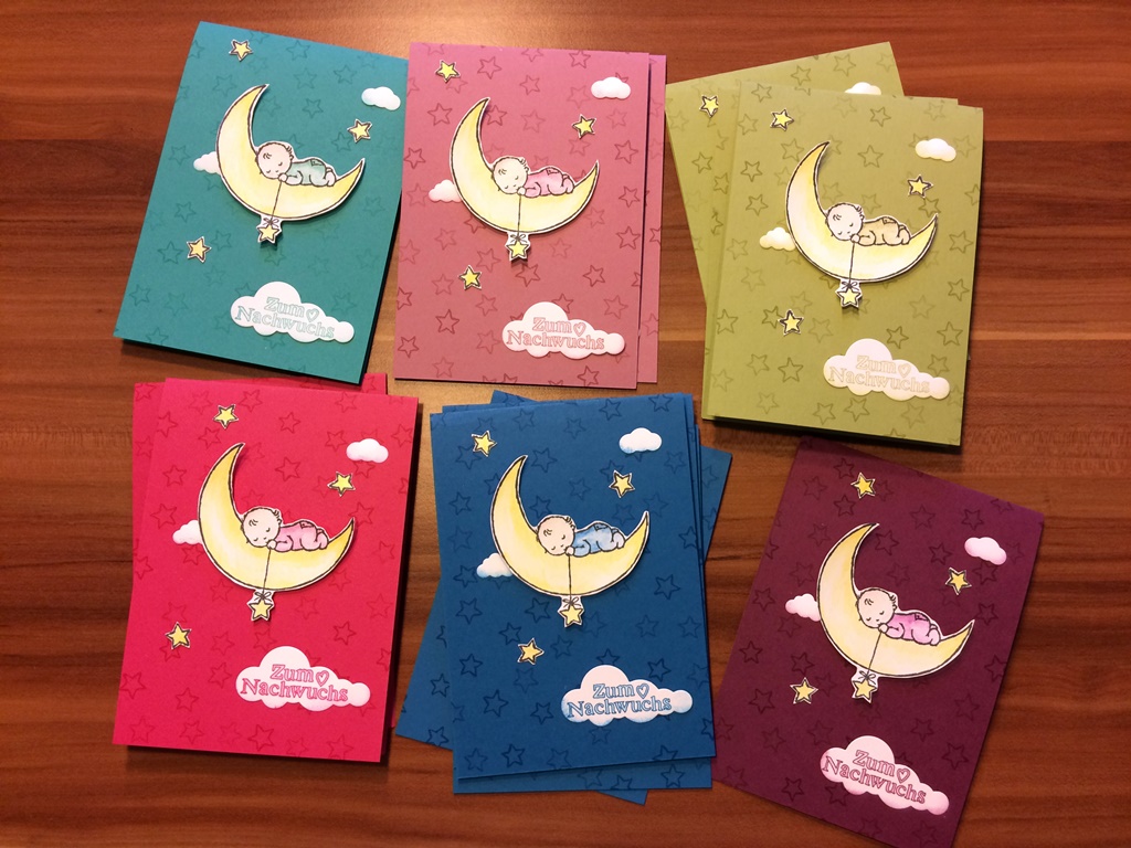 Gleich ein ganzer Stapel Babykarten ist mir neulich vom Basteltisch gehüpft. Das Set „Moon Baby“ macht es einem wirklich leicht! Mit den Aquarellstiften muss ich noch etwas üben, aber immerhin konnte ich mich endlich mal mit den Blender Pens anfreunden.