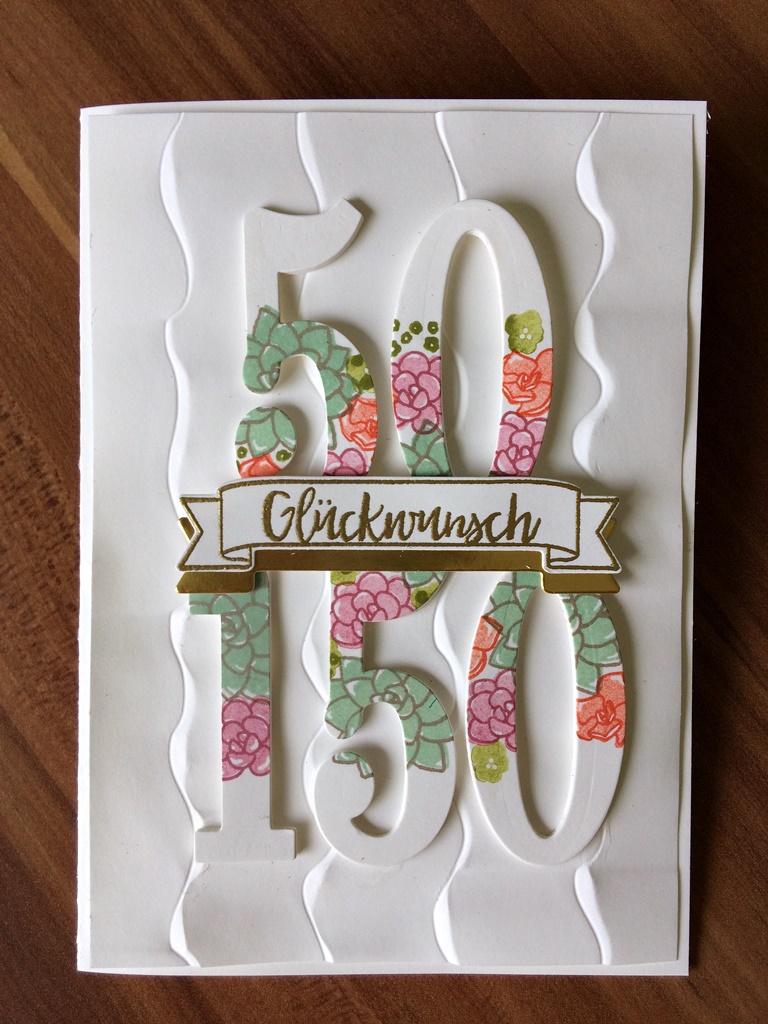 Diese Stempelvariante hat mich noch nicht ganz losgelassen… Die Gratulation zum kombinierten Geburtstag (150) und zum 50. Hochzeitstag kam da gerade recht. Ein wenig Gold für den richtigen Glanz und das schöne Rüschen-Prägemuster für den Hintergrund – fertig!