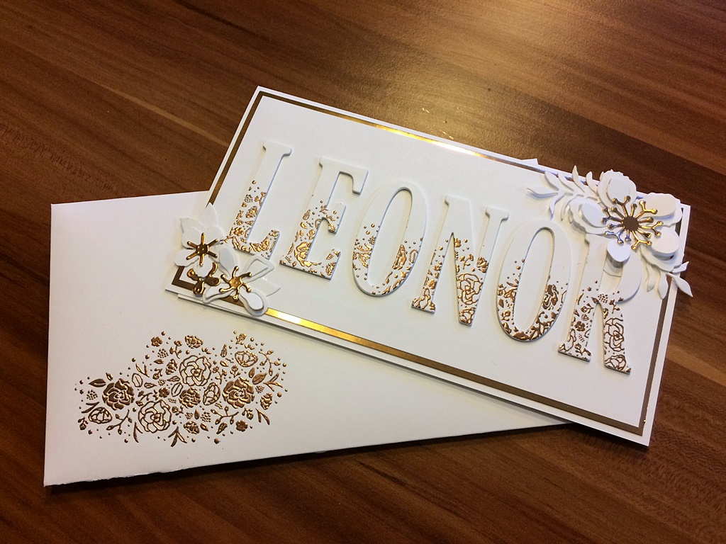 Die Technik mit den Large Letter Framelits hat es mir richtig angetan. Dieses Mal für eine etwas andere Babykarte – keine süßen Bärchen, stattdessen Embossing in Kupfer. Ausnahmsweise in DIN lang, einem Format mit dem ich sonst nicht arbeite, da ich den Umschlag dann auch extra anfertige (der soll ja schließlich genauso schick sein wie die Karte). Aber sonst hätte der Name nicht draufpasst… Ich mag sie, und die Eltern hoffentlich auch!