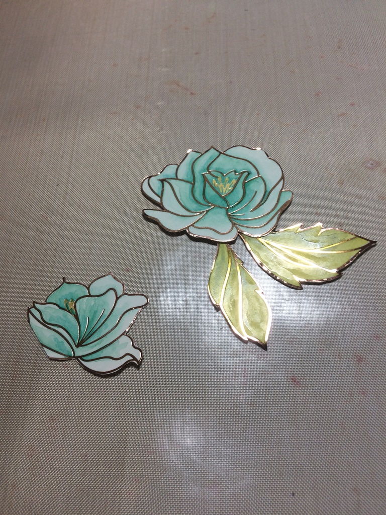 11) Jetzt noch schnell die Innenseite fertigmachen. Von dem Reststück Kupferfolie mit Prägung habe ich mir einen passenden Schnipsel aufgehoben, um ihn unter die Blüte kleben zu können. Das Pergament-Blatt wird wieder an die Blüte geklebt und die dann mit dem Kupfer-Stückchen unten in die Ecke.