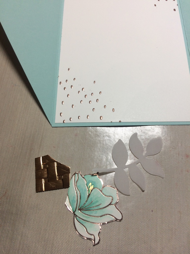 11) Now let’s quickly finish the inside. I kept a little piece of the embossed copper foil and glued that right into the corner on the inside. Again, the Vellum leaf is glued to the flower before adhering that to the inside of the card.