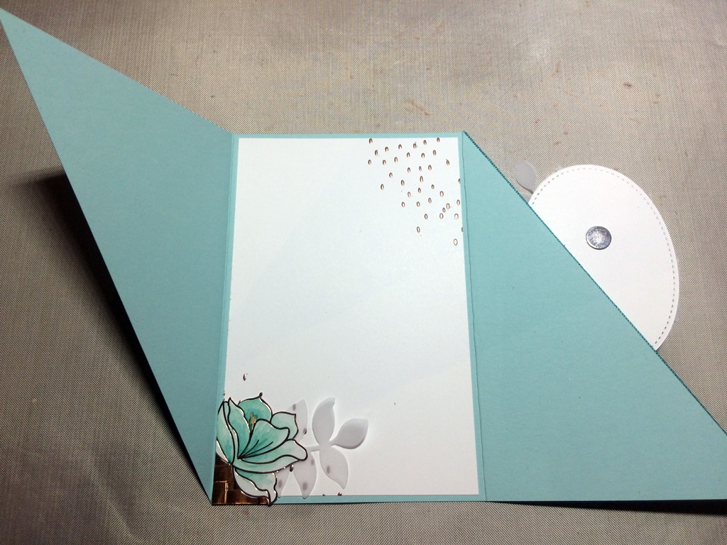12) Maybe you noticed the white oval and the little magnet in the last picture. I deleted the matching picture I took from the front – yay me! Well.. the oval is the back of the one from step 10, where you adhered the copper foil and flower to it. What you do is you close the card, lay the oval down where you want it and put dimensionals to the back of it, but only where it touches the DSP on the lower right flap!