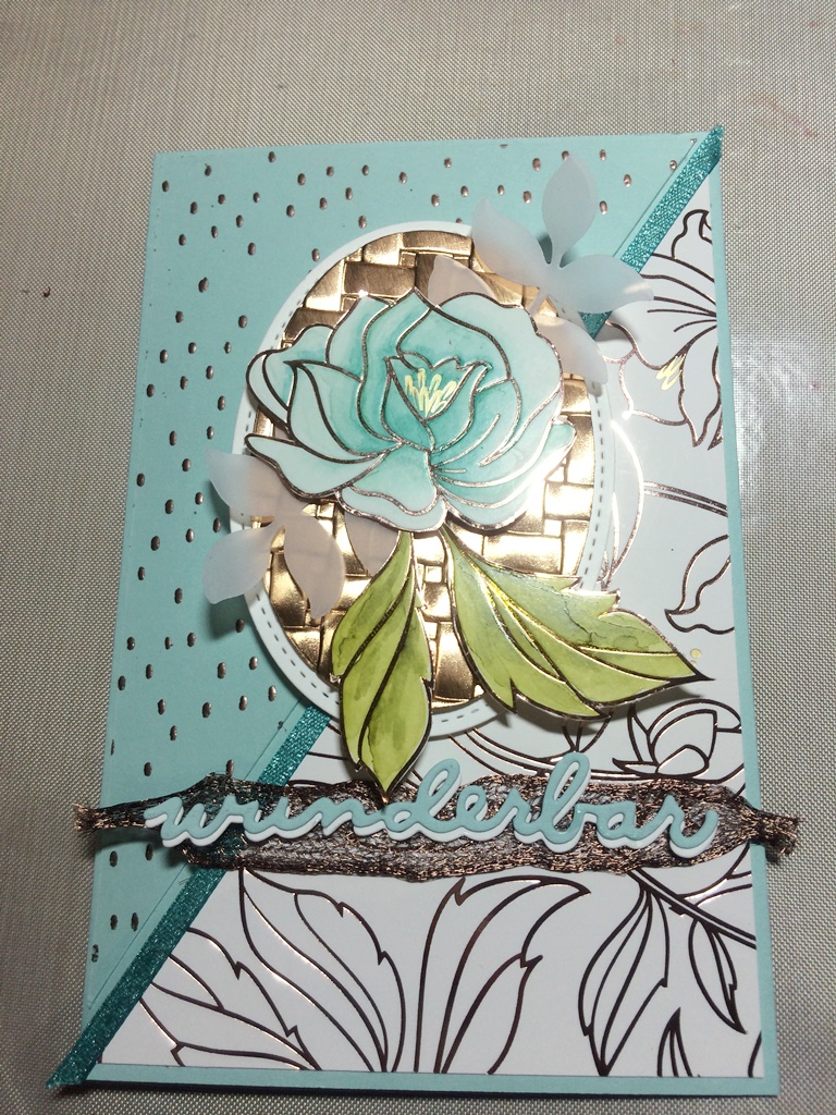 13) Puh… das Schwerste ist geschafft! Wusstest Du schon, dass man das Geschenkband in Kupfer auseinanderziehen kann? Das gibt einen schönen Netzeffekt, den ich hier als Hintergrund für das Wort „wunderbar“ genommen habe. Das Band habe ich mit Präzisionskleber festgeklebt, dann kommen die beiden ausgestanzten Worte mit leichtem Versatz darüber. Fertig!!