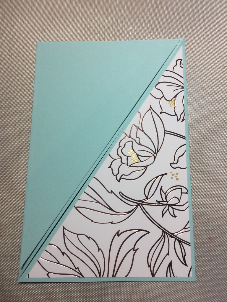 5) Cut a piece of the Springtime Foils Specialty Designer Series Paper to 9,2 x 14 cm and cut it in half diagonally. This will be the layer for the right front panel. Make sure it fits the panel with a nice even border and trim any excess if necessary (e.g. because the panel needed adjustment for the card to close properly). Then take one of the cut off pieces of Pool Party card stock and trim it to the same size as the DSP, this will be the layer for the left front panel. I simply lay the cardstock on top of the DSP and mark with a pencil where the DSP ends, then I put the piece down on the Paper Trimmer so the marks are in the cutting groove and cut off the excess. Both triangles should fit the front panels now. You can use the adhesive of your choice to glue down the DSP, but do not glue down the cardstock yet!