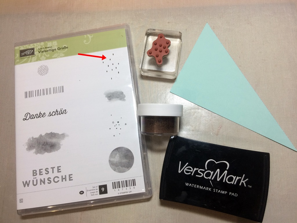 6) Das Farbkarton-Dreieck habe ich nun noch mit den länglichen Pünktchen aus dem Sale-A-Bration-Set Vielseitige Grüße in VersaMark bestempelt und mit dem Kupfer-Pulver embosst.