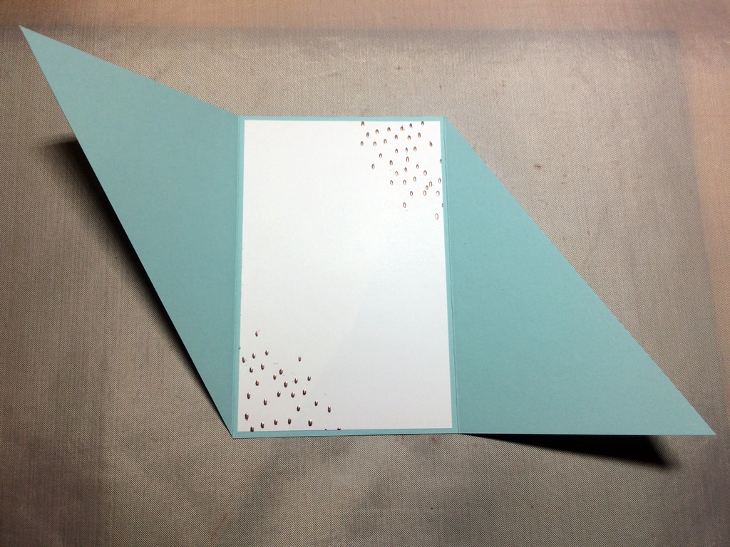 7) Und da ich das Pulver gerade draußen hatte, habe ich für die Innenseite gleich noch die Ecken eines Stücks Flüsterweiß (9,3 x 14,3 cm) ebenfalls bepunktet. Vergesst nicht – wie ich, offensichtlich – vorher mit dem Embossing Buddy drüberzugehen! Die Lage kannst Du innen schon mal einkleben.
