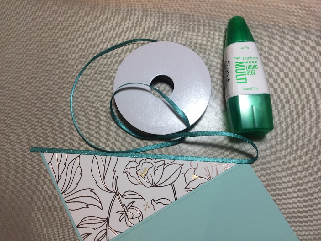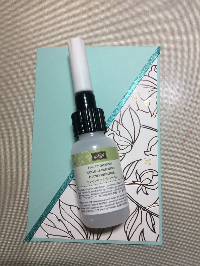 8) I glued down a bit of the thinnest ribbon out of the Sale-A-Bration Shimmer Ribbon Pack to the edge of the front flap with the DSP, using the Multipurpose Glue. If you worry about the edge of the ribbon fraying after cutting off the excess, you can apply a bit of the Fine Tip Glue to the end. It dries clear and non-sticky, but will keep the threads in place.