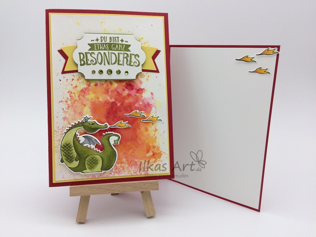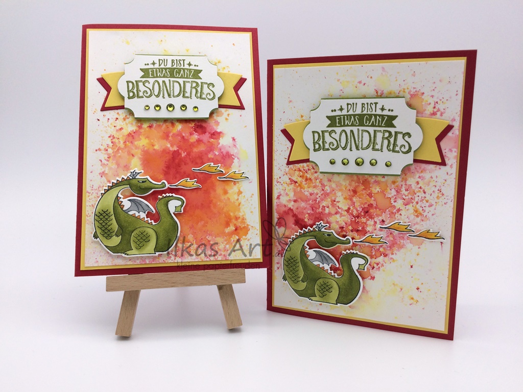 Die Karte selbst ist eine leichte Abwandlung von einer, die ich bei Sigrid Joch gesehen habe. Sie war allerdings etwas geschickter bei der Textwahl, dass man meinen in Zusammenhang mit einem feuerspeienden Drachen falsch verstehen könnte ist mir erst beim fotografieren gedämmert – ups!! Na gut, muss der Empfänger eben meinen schrägen Humor teilen…