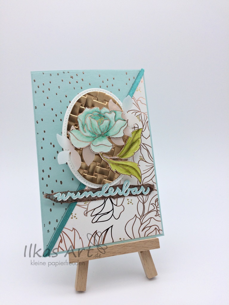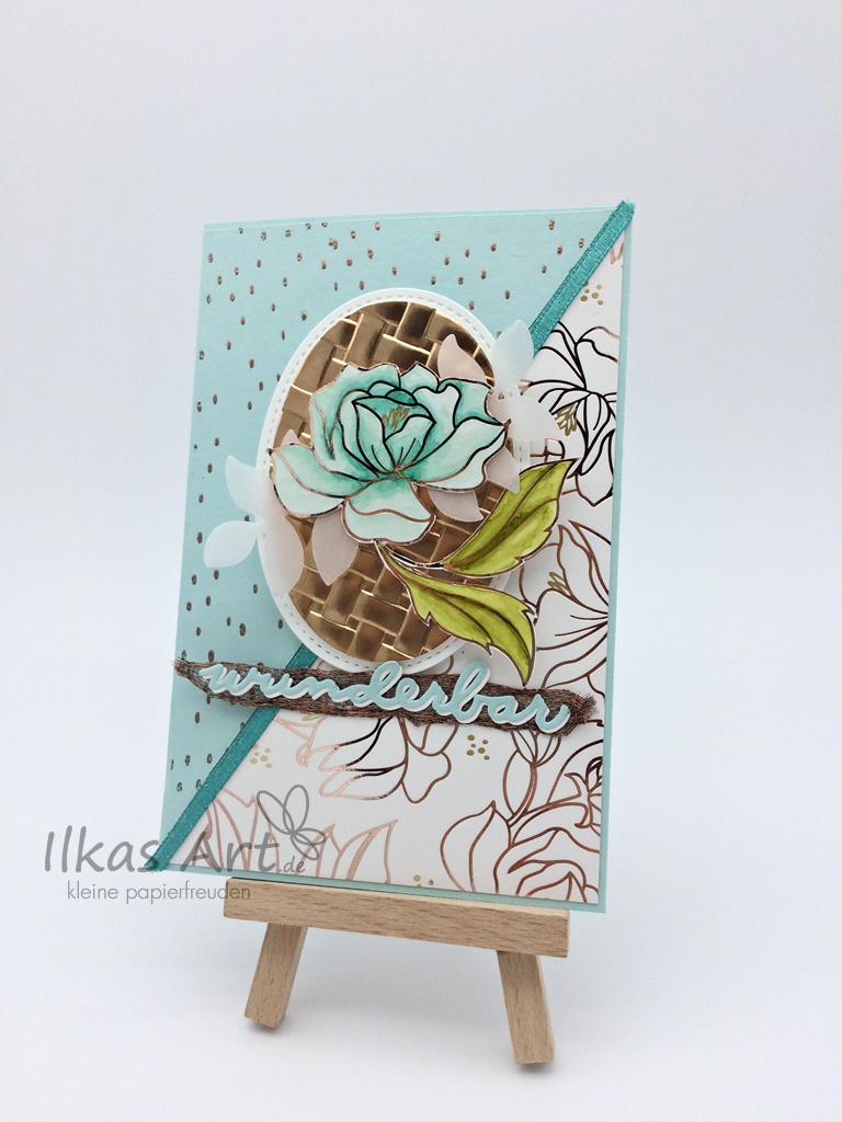 I knew immediately that I wanted to use the wonderful Springtime Foils Specialty Designer Series Paper for my project. The lovely designs combined with the metallic foil are gorgeous, and as I seem to have a slight obsession with everything copper when it comes to crafting it was an easy decision to go for the flower pattern. I only had a rough idea for the card when I started, something along the lines of „oohhh, one of the flowers on a basket weave piece“ and the diagonal opening. It wasn’t my intention to use only Sale-A-Bration items, but in the end I’m suprised how many I actually used on the card. This just shows how great the different products go together and how easy they can be combined!