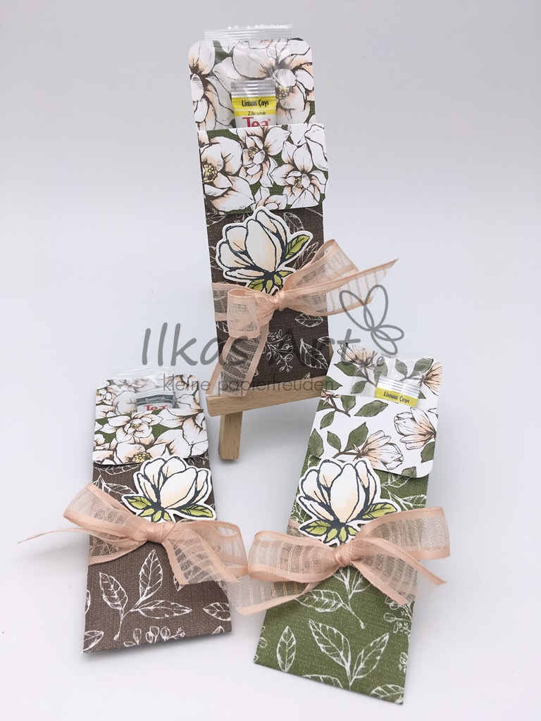 Übrigens ist mit einem Papier aus dem Angebot, dem Designerpapier „Magnolienweg“, ratzfatz diese kleinen Teestick-Verpackung entstanden: