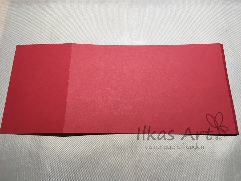 Falze den Farbkarton auf der langen Seite bei 8,1 cm von der einen Seite und 0,6 cm von der anderen Seite. Dazwischen ist Platz um das Designerpapier festzukleben. Nach dem Aufkleben kann man den Farbkarton über das Falzbein oder eine Tischkante ziehen, um ihn etwas zu runden. Der 0,6 cm schmale Streifen ist die Klebelasche, sie wird am äußeren Rand auf der gegenüberliegenden Seite festgeklebt.
