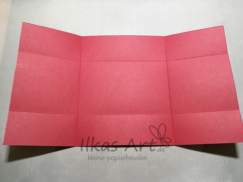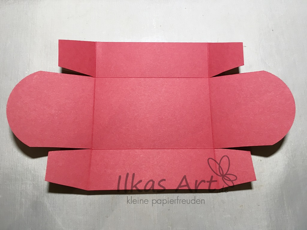 Das große Stück Farbkarton mit den Maßen 28,5 cm x 16 cm wird auf der langen Seite bei 8 cm von beiden Seiten gefalzt, auf der kurzen bei 4 cm von beiden Seiten. Die Ecken werden eingeschnitten und ungefähr halbiert, so dass Klebelaschen entstehen. Der übrige Teil in der Mitte wird genauso abgerundet wie oben beschrieben.