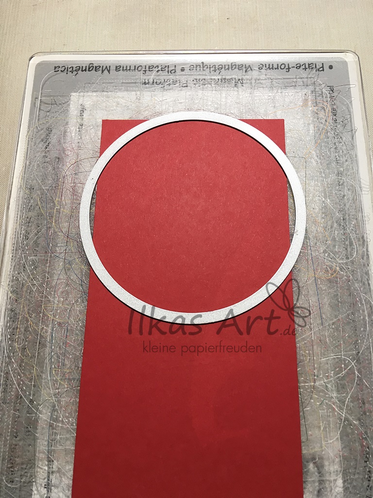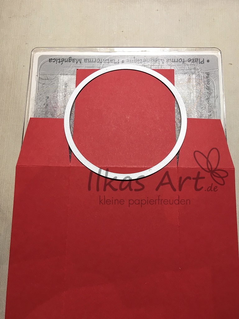 Der Farbkarton mit den Maßen 15,3 cm x 8 cm wird eine Ziehhilfe um die Schublade später einfacher aus der Hülle ziehen zu können. Um die Kante abzurunden habe ich eine Kreisstanzform der Größe 8,5 cm benutzt (ca. 3 3/8 Zoll). Sie wird ganz knapp an die obere Kante gelegt und nur bis zum Widerstand durch die Big Shot gedreht, dann wieder zurück. So wird nicht der ganze Kreis gestanzt sondern nur die obere Kante.