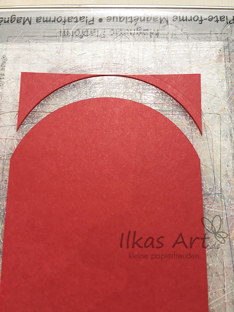 The cardstock measuring 15,3 cm x 8 cm will be used to pull the drawer from the box more easily. To round the edge I used a circle die measuring 8,5 cm (about 3 3/8 inches). It is placed right on the edge of the cardstock. This side is put into the Big Shot first and the handle is only cranked so far that you feel a bit of resistance, and then back. This way it’s not the whole circle that is cut but only the upper edge.