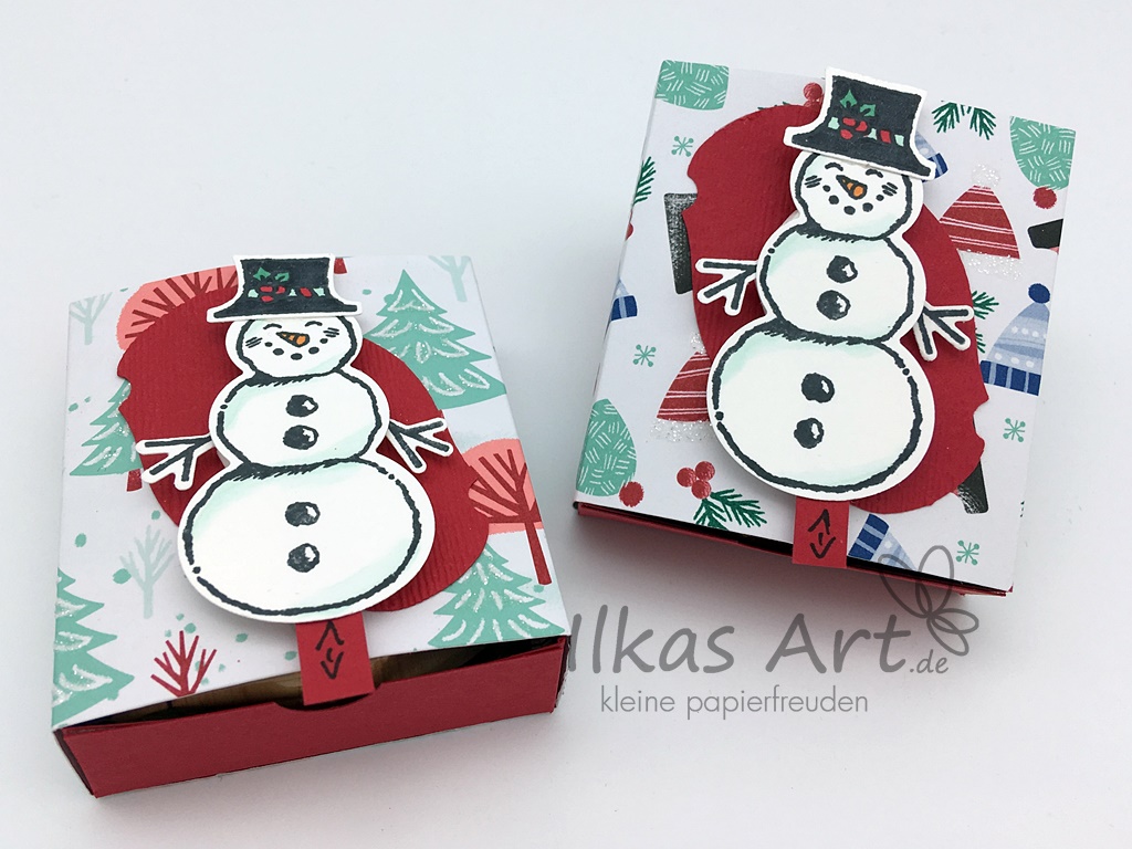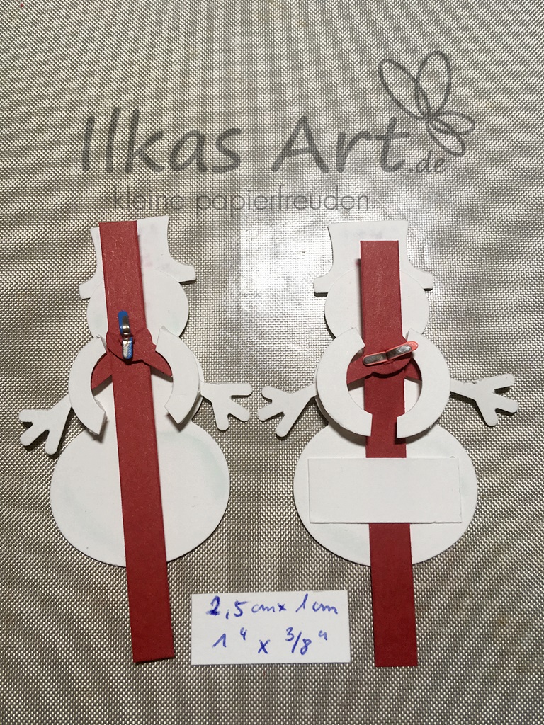 Damit der Streifen nur nach oben und unten bewegt wird und um den Schneemann mit Dimensionals auf der Box befestigen zu können, habe ich noch ein Reststück Flüsterweiß als Führung aufgeklebt. Wichtig: der Kleber darf nur links und rechts aufgetragen werden, nicht den roten Streifen mit den Armen festkleben!