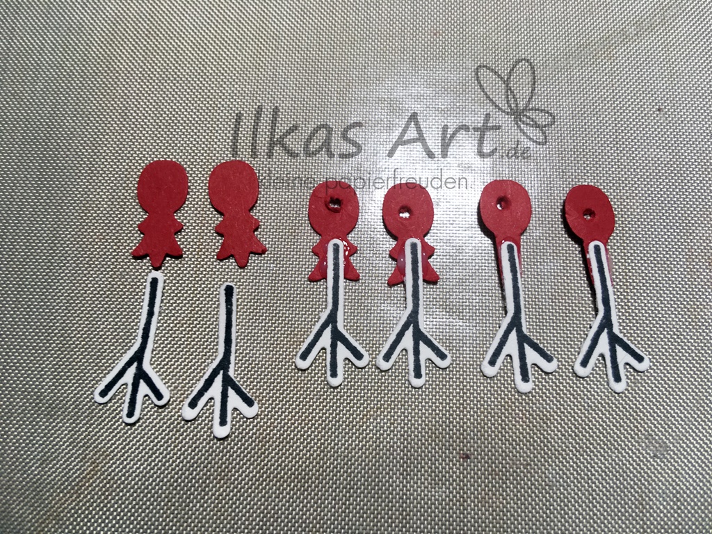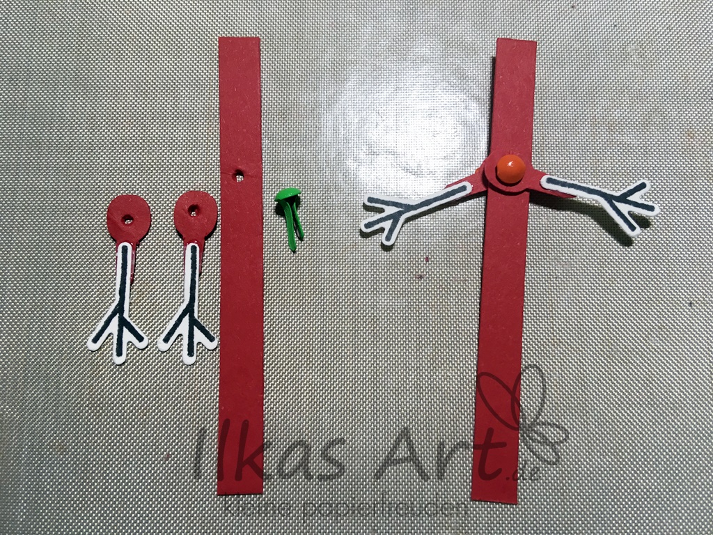 Die Arme habe ich mit einem Brad an einem Streifen Farbkarton (ca. 0,7 cm x 7,5 cm) befestigt; je einen vor und einen hinter dem Streifen. Die Länge muss nicht exakt sein, was übersteht wird später noch abgeschnitten.