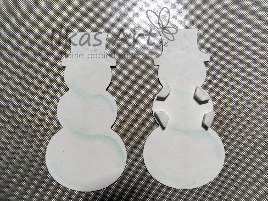 Jetzt müssen die Einzelteile nur noch zusammengesetzt werden. Für die Armführung habe ich 2 Mini-Dimensionals aufeinandergeklebt, halbiert und dann auf der Rückseite des Schneemanns aufgeklebt. Die Arme werden wie auf dem Bild gezeigt aufgelegt und mit den Halbringen fixiert.