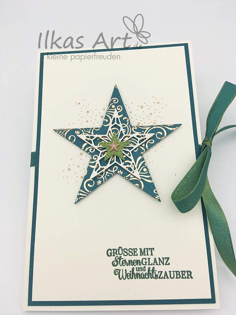 Da die Empfängerin in ihren Werken eher einen klaren, schlichten Stil hat, habe ich versucht das etwas nachzuahmen. Ich habe nur 3 der 23(!) Stanzformen aus dem Produktpaket „Sternenglanz“ benutzt – bei der Auswahl gar nicht so einfach, sich zu entscheiden bzw. nicht ständig noch hier und da etwas hinzuzufügen. Manchmal ist es tatsächlich das schwerste, einfach etwas Platz leer zu lassen!