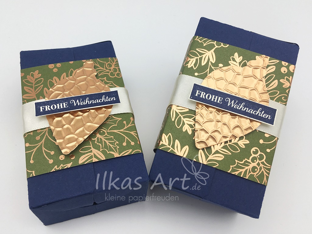 Ich habe das Designerpapier stattdessen als Banderole benutzt und noch etwas Schleifenband in den Mix geworfen, damit sich die kupferfarbene Kugel besser absetzt. Ausgestanzt, geprägt, mit einem kleinen Spruch aufgeklebt, das wars!