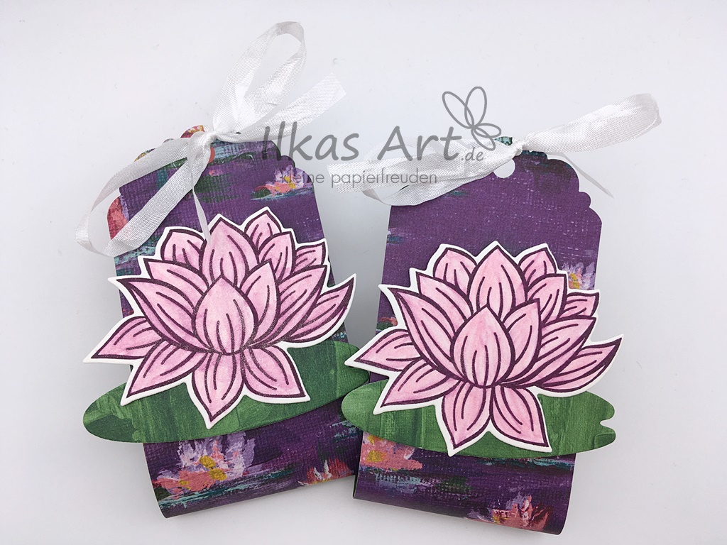 Die Rückseite des Papiers ist grün gemustert und hat sich damit wunderbar angeboten, um daraus das Seerosenblatt auszustanzen. Hier könnte man noch richtig viel Deko anbringen; Perlchen oder Straßsteine, Metallicgarn oder eine weiße Kordel kann ich mir gut vorstellen. Ich habe es einfach gehalten und nur mit dem Wink of Stella-Stift die Blüte angemalt, so dass sie ganz zart schimmert. So waren diese Kleinigkeiten blitzschnell, innerhalb von nur ein paar Minuten fertig.
