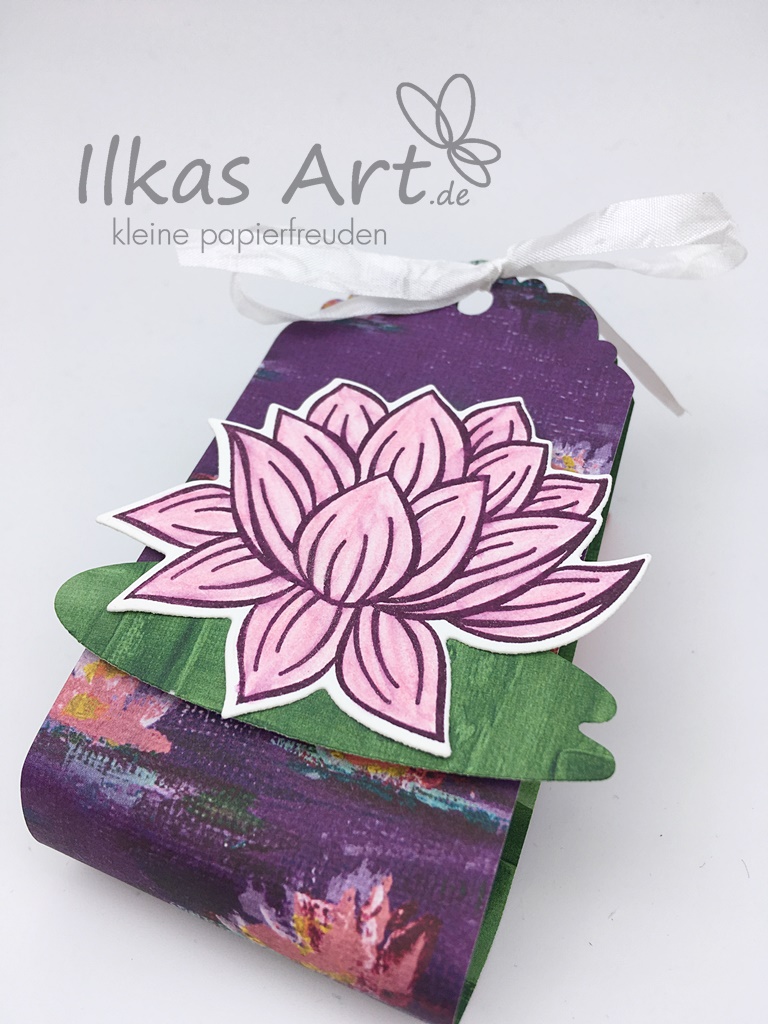 Für meine Version habe ich für das Designerpapier und die Verzierung die Seerosen-Produkte aus der Sale-A-Bration verwendet. Papier, Stempel und Stanzformen gibt’s also kostenlos! Die Seerose habe ich in der Farbe Brombeermousse gestempelt, mit dem Aquarellstift in Flamingorot ausgemalt und das dann mit einem nur ganz leicht feuchten Aquapainter verstrichen.